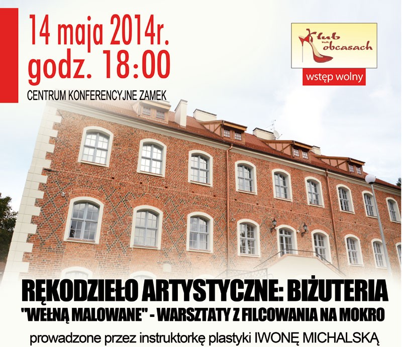 Majowe spotkanie Pań w Klubie Na Obcasach będzie miało charakter warsztatowy; będą to warsztaty z flicowania na mokro. Tą techniką Panie wykonają biżuterię: broszki, korale lub kolczyki, które na pewno będą oryginalne , eleganckie, z odrobiną magii. Prezentacja rękodzieła artystycznego oraz warsztaty pt. "Wełną malowane" poprowadzi instruktor plastyki Iwona Michalska. Nie zabraknie też dedykacji muzycznej w wykonaniu dziewcząt ze Studia Wokalnego SAPiK dla Mam z okazji ich święta. Panie otrzymają też upominki. Spotkanie odbędzie się 14 maja 2014 r o godzinie 18.00 w Centrum Konferencyjnym Zamek. Zaprasza:Samorządowa Agencja Promocji i Kultury oraz Klub Na Obcasach. Wstęp wolny. (sapik)