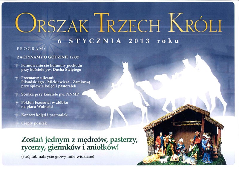 Orszak Trzech Króli wyruszy spod kościoła parafii pw. Ducha Świętego 6 stycznia o godzinie 12.00. Przemarsz będzie miał miejsce ulicami Piłsudskiego, Mickiewicza i Zamkową. Przy kościele mariackim będzie można zobaczyć bożonarodzeniową scenkę. Koniec przemarszu nastąpi na placu Wolności. Tam Trzej Mędrcy ze Wschodu złożą pokłon Jezusowi w żłóbku. Na wszystkich uczestników przemarszu będzie czekał ciepły posiłek. Warto nadmienić, że w organizację Orszaku zaangażowały m.in. SAPiK czy OSiR. Ale nie tylko. W przedsięwzięciu tym będą też uczestniczyć samorządowcy.