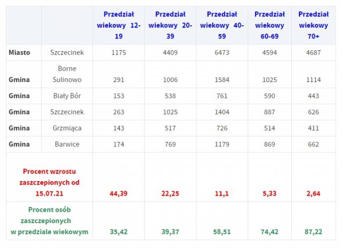 Procent mieszkańców zaszczepionych w wieku 60-69 to aż 74,42%, natomiast 70+ to 87,22% populacji