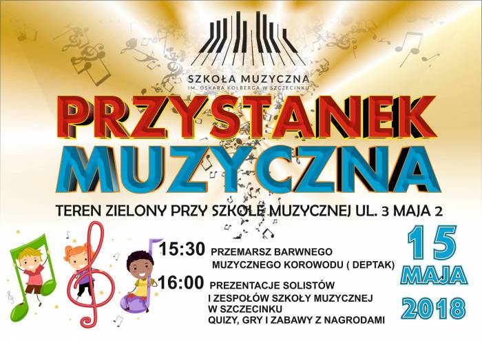 Jakie atrakcje przygotowano? Impreza rozpocznie się o godzinie 15.30 od radosnego, kolorowego przemarszu. Muzyczny korowód przejdzie ulicami w centrum Szczecinka. Następnie, około godziny 16.00 wszyscy spotkają się na terenie zielonym przy szczecineckiej szkole muzycznej. Przez całe popołudnie odbywać się tam będą prezentacje solistów i zespołów Szkoły Muzycznej. Na uczestników czekają różne quizy, gry i zabawy. Organizatorzy już teraz wszystkich serdecznie zapraszają.