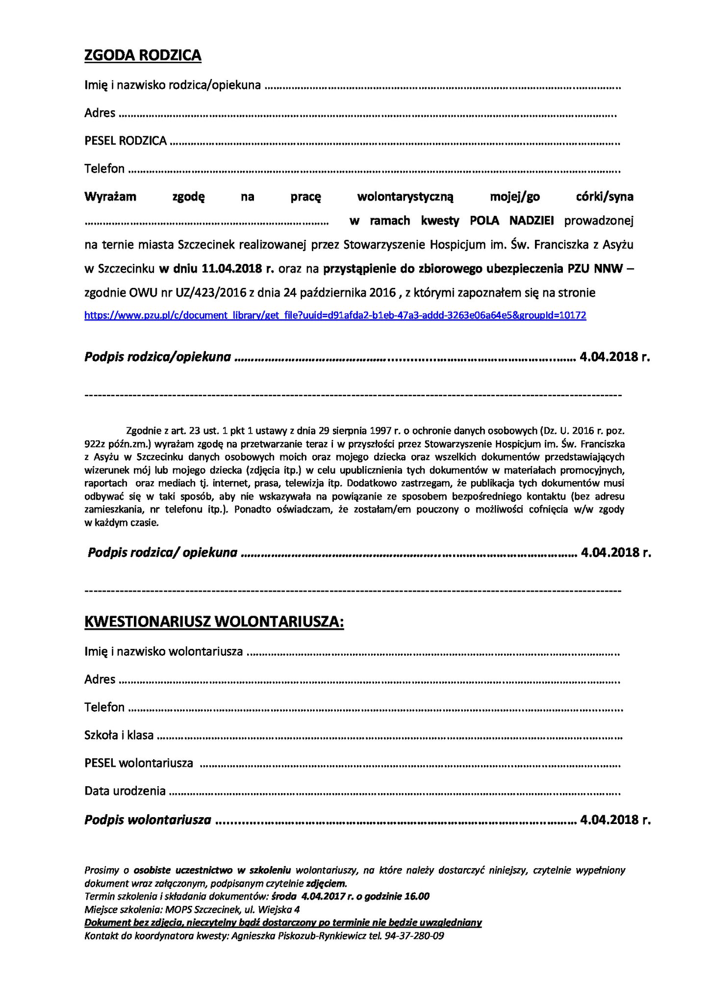Wystarczy pobrać formularz wolontariusza, który także będzie dostępny u szkolnych pedagogów czy koordynatorów szkolnego wolontariatu. Wypełniony kwestionariusz wraz ze zdjęciem trzeba będzie przynieść na odbywające się przed kwestą szkolenie wolontariuszy. Szkolenie zaplanowano na dzień 4 kwietnia (środa) na godz. 16.00. O szczegółowe informacje można również zapytać koordynatora akcji pod nr tel. 94 37 280 09.