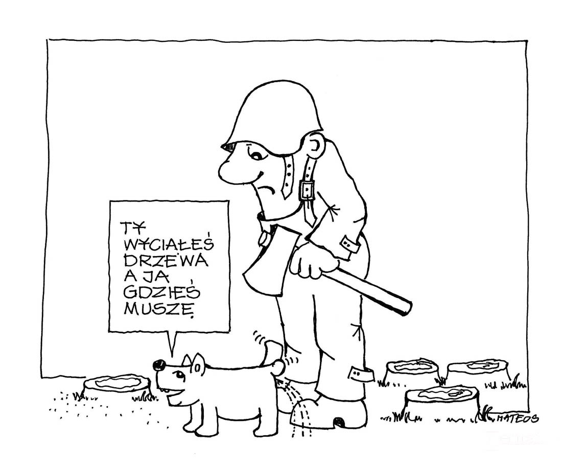 Zdziwko, i to niemałe, mnie łostatnio chwyciło... Bowiem, niby o co ten krzyk (co by nie rzec wrzask) się u nas podniósł? Wieść brzmiała: w Warszawie, co jak wiadomo stolicą jest, na jakimś skwerze kilkadziesiąt drzew wycięto! Inne media donosiły, że tu i ówdzie, i jeszcze gdzieś tam, parę hektarów lasu i inszych drzewostanów pokotem leży! Na dokładkie, wszystkie jakby się szaleju najedli nic ino HUZIA NA JÓZIA, choć przecie wiadomo, że minister środowiska nie Józio tylko Jan na imię ma. Ja natomiast się pytam: za co? Czy za fakt, że rżnąc Puszczę Białowieską, przed podstępnym kornikiem ją obronił? Za to, że stanął w obronie świętego prawa własności? A do czego to było podobne, aby właściciel drzewa zawalidrogi sztuk raz albo i kilkuset, pokornie urzędnika błagać musiał o wydanie zgody na jego, czy też ich wycięcie.