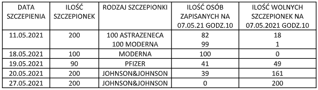 Dla przykładu: 11.05 będzie dostępnych 200 szczepionek (100 AstraZeneca i 100 Moderna), liczba osób zapisanych wynosi odpowiednio 82 i 99, dostępnych pozostaje nadal 18 szczepionek AstraZeneca i 1 Moderna (stan na 7.05, godz. 10:00).