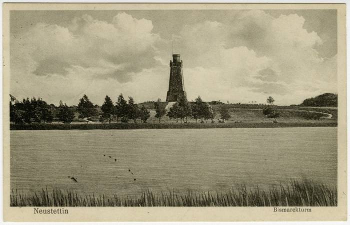 W tym też czasie władze Neustettin postanowiły - wzorem innych niemieckich miast - upamiętnić kanclerza Bismarcka. Wprawdzie już wcześniej poświęcono mu jeden z trzech wielkich głazów ustawionych w parkowym lapidarium, ale tym razem postanowiono uczcić go jeszcze godniej poprzez budowę wieży. W 1907 roku wpłynęła do ratusza oferta od Denning’a , w której– poczuwając się do patriotyzmu -oferuje, że odda swój grunt pod budowę za darmo. Parcela liczyła ok. 900 mkw i znajdowała się na nadjeziornym wzgórzu, kryjącym wczesnośredniowieczne grodzisko. Burmistrz ofertę przyjął. Powołano komitet, który zajął się zbiórką pieniędzy zarówno w mieście jak i okolicznych wsiach. Ponoć mieszkańcy grosza nie skąpili, więc wkrótce rozpoczęła się także budowa.