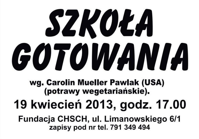 W piątek, 19 kwietnia o godz. 17:00 w siedzibie fundacji CHSCH przy ul. Limanowskiego 6, przeprowadzona zostanie kolejna sesja programu Szkoła Zdrowego Gotowania wg Carolin Muller-Pawlak, specjalistki zdrowego wegetariańskiego odżywiania.