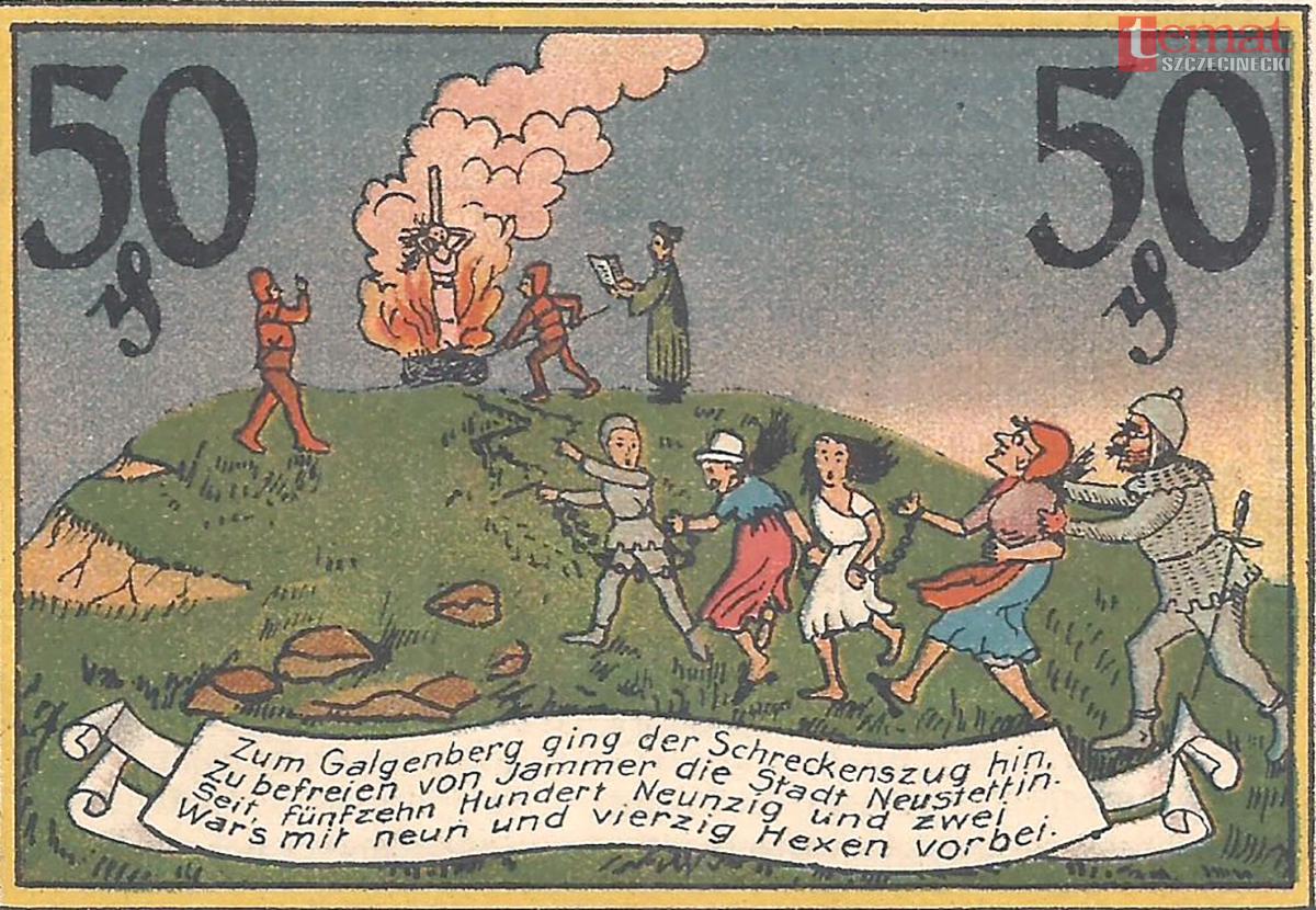 Trzeci nominał przedstawia scenę egzekucji. Na szczycie Wisielczego Wzgórza widać już płonący stos, a na nim stojącą w płomieniach niewiastę. Jeden z pomocników kata pilnuje ognia. Obok niego pastor w szatach liturgicznych czyta modlitwę. Dwóch miejskich pachołków wlecze skute łańcuchami trzy kolejne kobiety: Pociąg grozy dojechał do Wisielczej Góry, aby uwolnić miasto Neustettin od nędzy. Zarówno procesy jak i egzekucje cieszyły się olbrzymim powodzeniem. Osoby zajmujące się magią były posądzane o spowodowanie różnych nieszczęść wobec sąsiadów – stąd zapewne ich społeczne przyzwolenie.