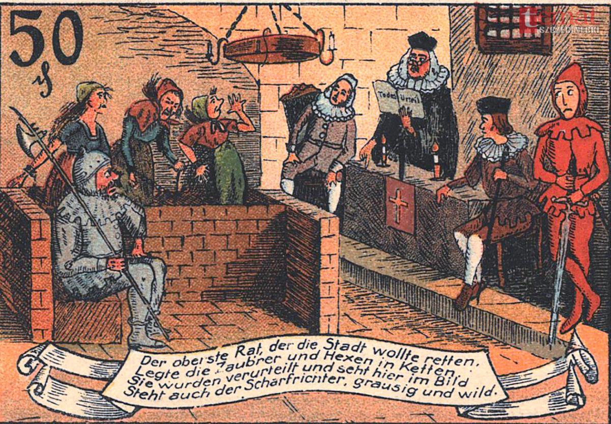 Na drugim nominale o tej samej wartości, przedstawiono rozprawę sądową. Najprawdopodobniej jest to moment odczytywania wyroku, a być może aktu oskarżenia. Sędzia odczytuje go na stojąco. Po obu jego stronach, w dość niedbałej pozycji siedzą dwaj ławnicy. Na ławie oskarżonych lamentują skute łańcuchami trzy kobiety. W ramce dramatyczne spostrzeżenie: Oto kat „makabryczny i dziki” przebiera już niecierpliwie nogami, czekając aż dopełni się okrutny los trzech zakutych w kajdany czarownic. Dzięki radnym (miejskim) ocaleje miasto.