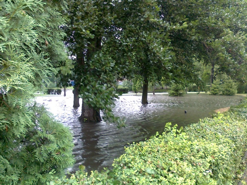 Kilka solidnej powierzchni i głębokości "jeziorek" powstałych po dzisiejszej nocnej (wtorek 30.07) ulewie upodobało sobie ptactwo wodne bytujące na Trzesiecku (na zdjęciach rozlewisko przy ul. Mickiewicza i Boh. Stalingradu). Tak czy owak ta stojąca woda (brudna) prędzej czy później trafi do jeziora. Niedawno pod ulicą Mickiewicza remontowano kanalizację. Była więc doskonała okazja, by definitywnie zakończyć wodne problemy parku. A może nie jest jeszcze za późno? (sw)