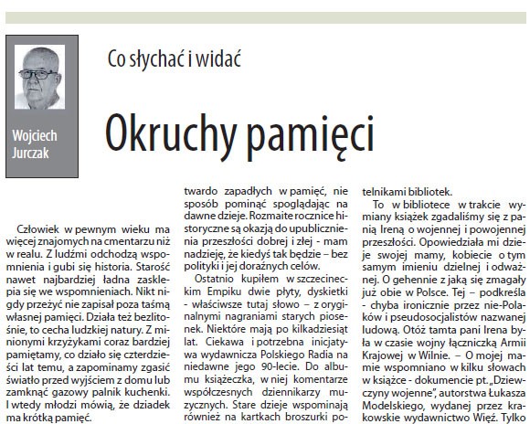 To w bibliotece w trakcie wymiany książek zgadaliśmy się z panią Ireną o wojennej i powojennej przeszłości. Opowiedziała mi dzieje swojej mamy, kobiecie o tym samym imieniu dzielnej i odważnej. O gehennie z jaką się zmagały już obie w Polsce. Tej – podkreśla - chyba ironicznie przez nie-Polaków i pseudosocjalistów nazwanej ludową. Otóż tamta pani Irena była w czasie wojny łączniczką Armii Krajowej w Wilnie. – O mojej mamie wspomniano w kilku słowach w książce - dokumencie pt. „Dziewczyny wojenne”, autorstwa Łukasza Modelskiego, wydanej przez krakowskie wydawnictwo Więź. Tylko wspomniano – jakby z żalem mówi córka - choć życiorys mamy mógłby posłużyć za scenariusz filmu.