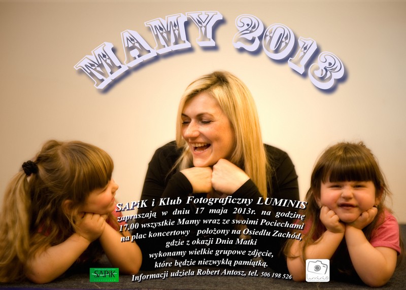 Dla wszystkich osób, które nie miały możliwości uczestniczenia we wspomnianych przedsięwzięciach, mamy dobrą wiadomość. Już za kilka dni nadarzy się okazja, aby znów stać się bohaterem wspólnej fotografii. Z okazji zbliżającego się Dnia Matki Klub Fotograficzny LUMINIS 17 maja (piątek) zaprasza wszystkie mamy oraz ich pociechy na plac koncertowy, znajdujący się na os. Zachód. Tam o godzinie 17.00 zostanie wykonana niezwykła pamiątka - wielkie grupowe zdjęcie.