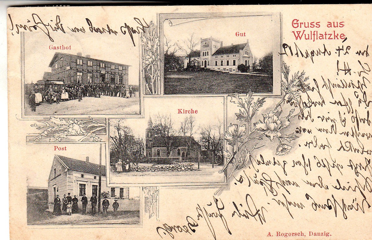 Archiwalna pocztówka pochodzi z początku XX wieku. Niejaki Georg zaadresował ją pisząc w lustrzanym odbiciu(!) 21 sierpnia 1912 roku. Na pocztówce został uwieczniony pałac – właściwie dwór- widziany od strony dziedzińca, kościół z kamiennym murkiem od strony szosy w kierunku Lotynia, szachulcowej konstrukcji zajazd z liczną grupą mieszkańców oraz budynek poczty. (jg)