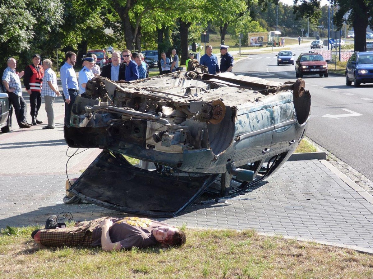 Ryk syren alarmowych wozów strażackich i karetek pogotowia ratunkowego. Wypadek przy ul. Jana Pawła II. Samochód osobowy uderzył w autobus pełen ludzi i dachował. Są ciężko ranni. To wszystko mogli dziś (czwartek 3.09) przed południem obserwować mieszkańcu Szczecinka - w ramach ćwiczeń szczecineckich służb ratowniczych pk. „Karambol 2015”.
