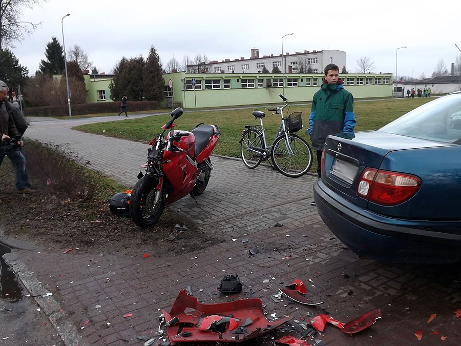 Tuż przed trzynastą na ul. Koszalińskiej doszło do zderzenia motocykla z samochodem osobowym. Kierujący nissanem almerą nie zauważył jadącego z naprzeciwka motocyklisty i zajechał mu drogę skręcając w lewo. Motocyklista przewrócił się i, szorując po mokrym asfalcie, uderzył w bok samochodu osobowego. Kierownica motocykla została zniszczona, podobnie jak bok samochodu osobowego. Na szczęście ludzie nie odnieśli poważniejszych obrażeń. Kierujący samochodem nie potrafił powiedzieć dlaczego nie przepuścił motocyklisty. Przybyli na miejsce policjanci „wynagrodzili” mandatem w odpowiedniej wysokości gapiostwo kierowcy. (rb)