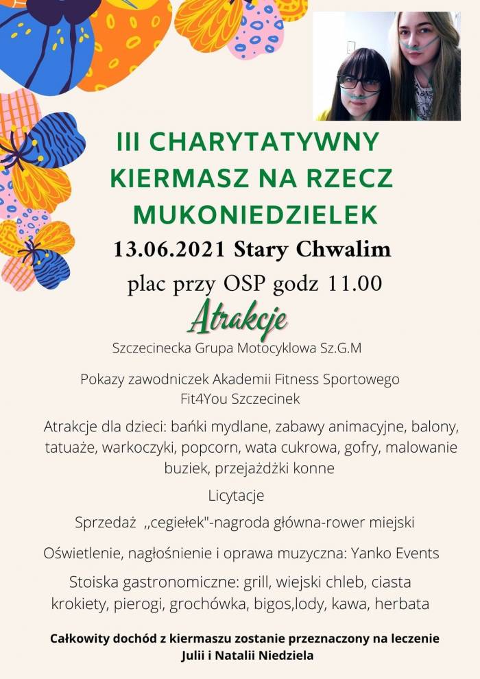 Obie chorują na mukowiscydozę i zbierają pieniądze na ratującą życie terapię. Tym razem na kiermaszu, który odbywać się na placu przy OSP w Starym Chwalimiu 13.06 od godz. 11.00 czekać będzie wiele atrakcji nie tylko dla dzieci. Pojawi się Szczecinecka Grupa Motocyklowa, odbędą się zawodniczek Akademii Fitness Fit4You Szczecinek, będą żywe maskotki, zabawy animacyjne, bański mydlane, malowanie twarzy, przejażdżki konno, ścianka zdjęciowa i licytacje. Sprzedawane będą także cegiełki, które wezmą udział w losowaniu nagrody - roweru miejskiego.