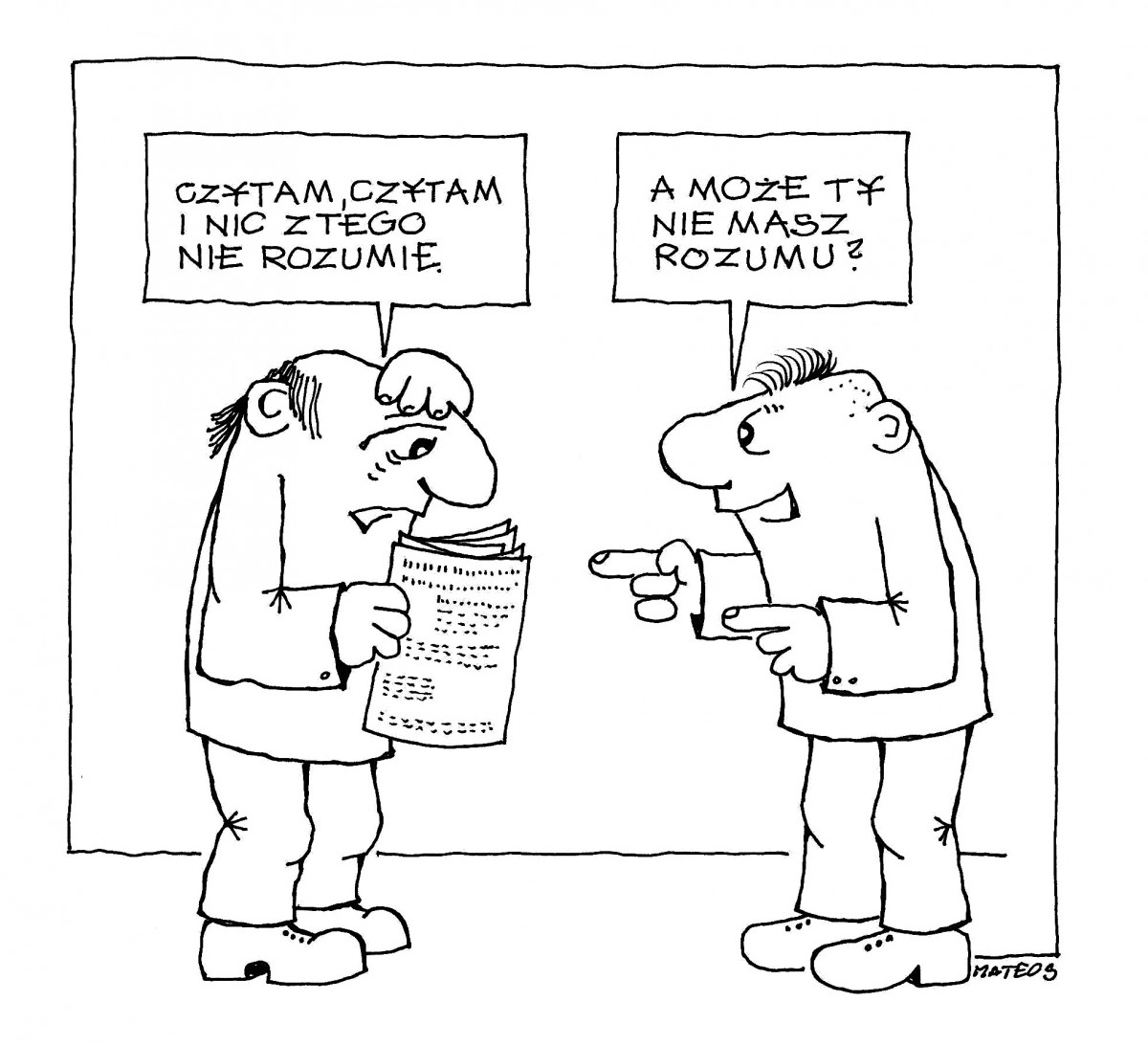 Wezwałem na pomoc ślubną. Nie znalazła. Sąsiad inżynier też znaleźć nie potrafił, ino ramionami wzruszał. Ciśnienie skoczyło mnie na 160, a w nocy śnił mi się komornik wynoszący mojego Samsunga. Kurza twarz, a może w 8-klasowej podstawówce, którą przed laty kończyliśmy, nie nauczono nas czytać ze zrozumieniem? Aby sprawę wyjaśnić, dokumentnie rankiem do biura obsługi klienta się udałem, błagając o jakoweś wyjaśnienie kabały, w którą się wkręciłem. Uprzejmy młodzian rzucił jednym okiem na plik moich kartek, drugą gałkę oczną kierując na ekran laptopa. Po niecałej minucie poinformował mnie że umowa jest OK. Płacić będę 29,99 złotych, czyli obiecaną dychę mniej. Na moje pytanie, czy nie można było umowy spisać na jednej kartce językiem prostym, zrozumiałym, uśmiechnął się z politowaniem i mi rzekł: No wie pan, każdy orze jak może, a ten KTOŚ z Warszawy to pewnikiem mistrzem orki jest!