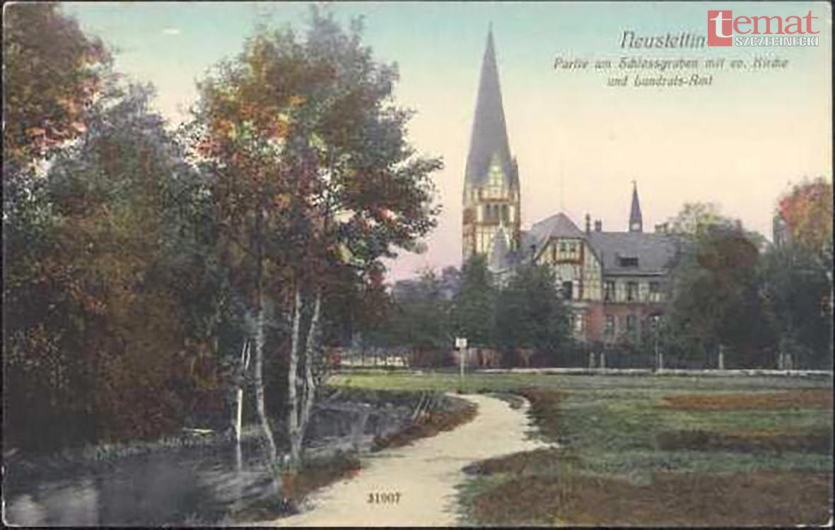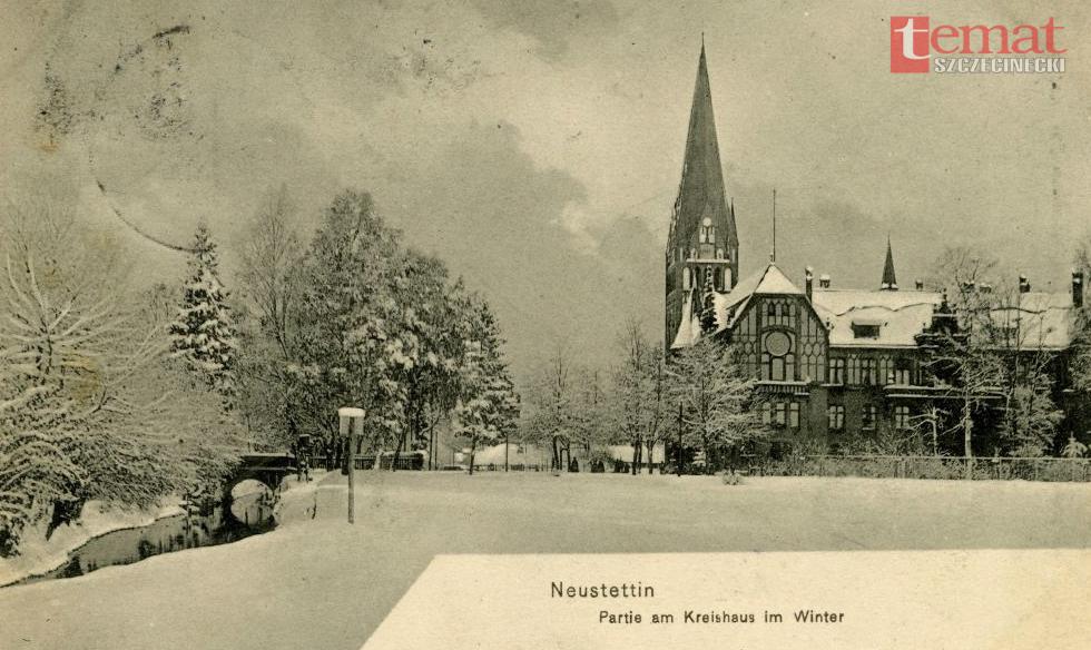 A oto te same ujęcie z 1909 roku wykonane w porze zimowej. Zabudowa kończy się okazałym parkanem otaczającym ówczesny gmach Starostwa (Kreishaus) dz. Państwowej Szkoły Muzycznej i dopiero co poświęconym kościołem (Nikolaikirche) św. Mikołaja (dz. NNMP).