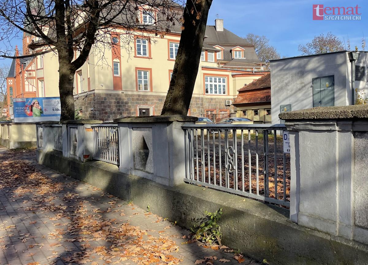 Uwagę zwraca, także od strony ul. Mickiewicza oryginalne ogrodzenie w postaci niskiego murku o niezwykle urozmaiconym planie. Jednym z charakterystycznych elementów, oprócz gzymsu, są kwadratowe otwory wypełnione dekoracyjną, stalową kratą. W latach 60. ktoś z partyjnych czynników dopatrzył się na niej swastyki (przypomnę parkan wykonano w 1925 r. a więc przed dojściem narodowych socjalistów do władzy). Nikt nie odważył się sprzeciwiać (a może innego zdania po prostu nie było) i wkrótce murki wypatroszono z ażurowych ornamentów.