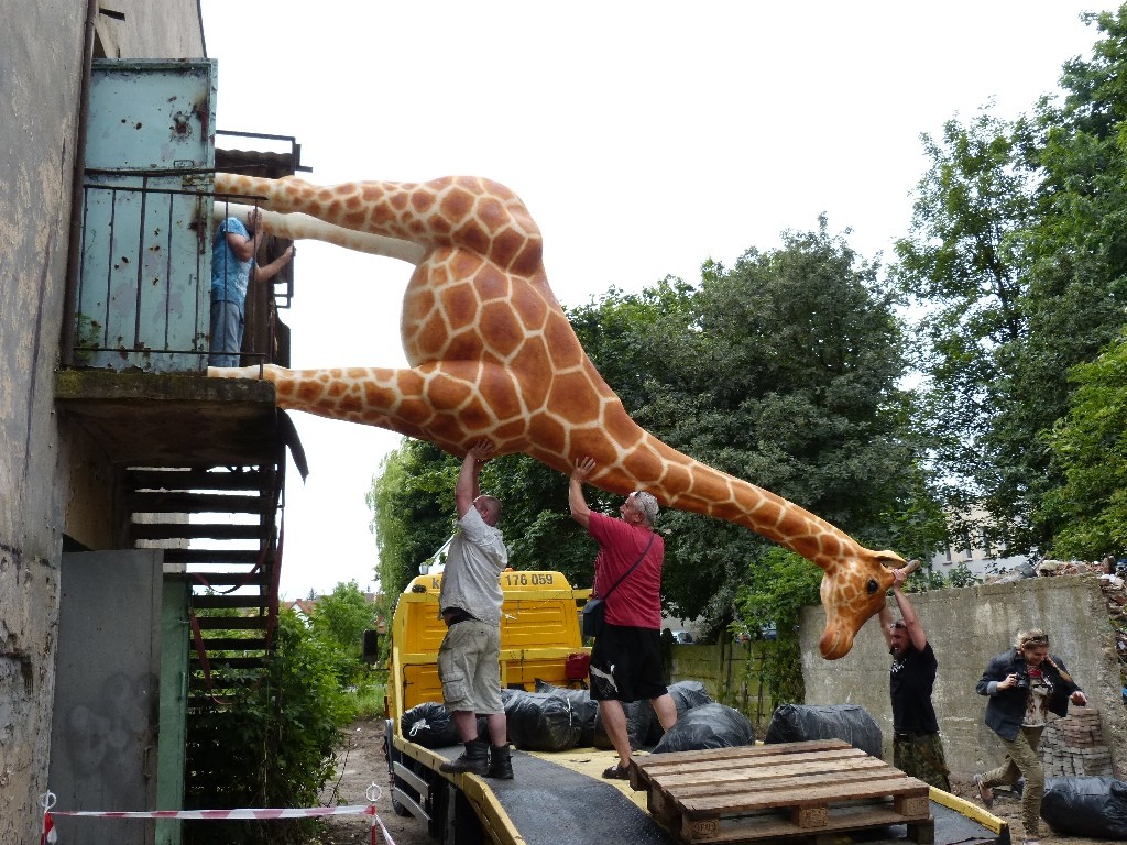 Operacja przetransportowania rzeźby z pracowni do nowego domu miała miejsce w poniedziałkowy (6 lipca) poranek i oczywiście wzbudziła spore zainteresowanie okolicznych mieszkańców, choć artyści z pewnością przyzwyczaili ich już do tak niecodziennych widoków. Ważąca blisko 100 kg żyrafa została ułożona na platformie i wyruszyła w podróż do „Canpolu”, gdzie możemy podziwiać ją w całej okazałości. Jak zapowiadają artyści, to z pewnością nie ich ostatnie tak duże dzieło. (mg)