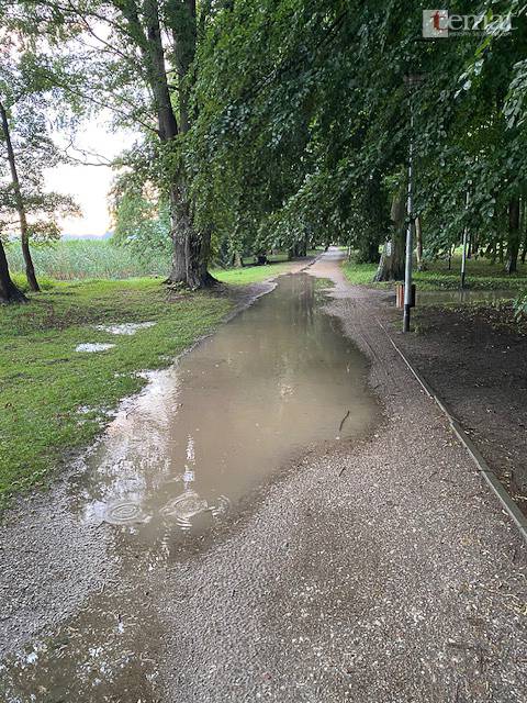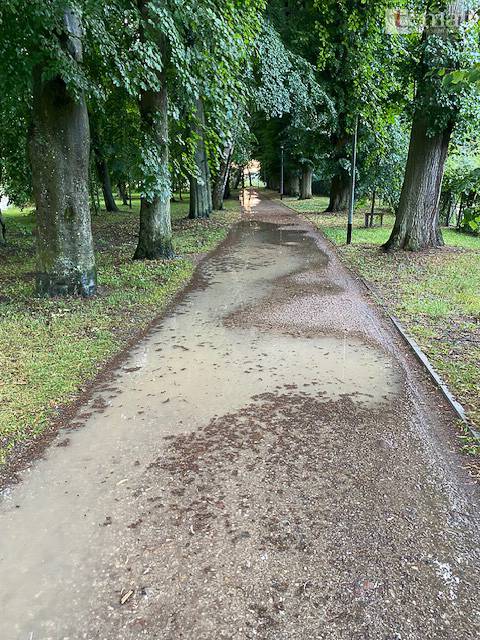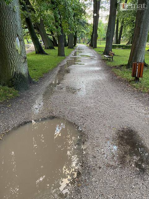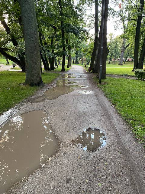 Jedna ze ścieżek parku miejskiego w Szczecinku po opadach zamienia się w dziurawy szlak