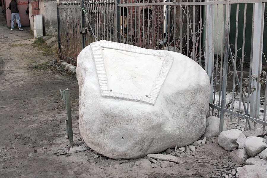 Głaz został już przygotowany do montażu, ale na razie znajduje się przy pracowni W. Adamskiego