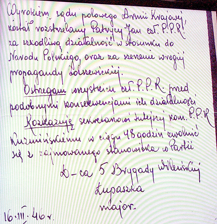 W środku mjr Zygmunt Szendzielarz ps. „Łupaszka” po lewej zastępca oddziału Lech Beynar po wojnie znany jako Paweł Jasienica. Brygada liczyła kilkudziesięciu partyzantów. Zdjęcie jednego ze szwadronów z czerwca 1946 wykonane w Borach Tucholskich.