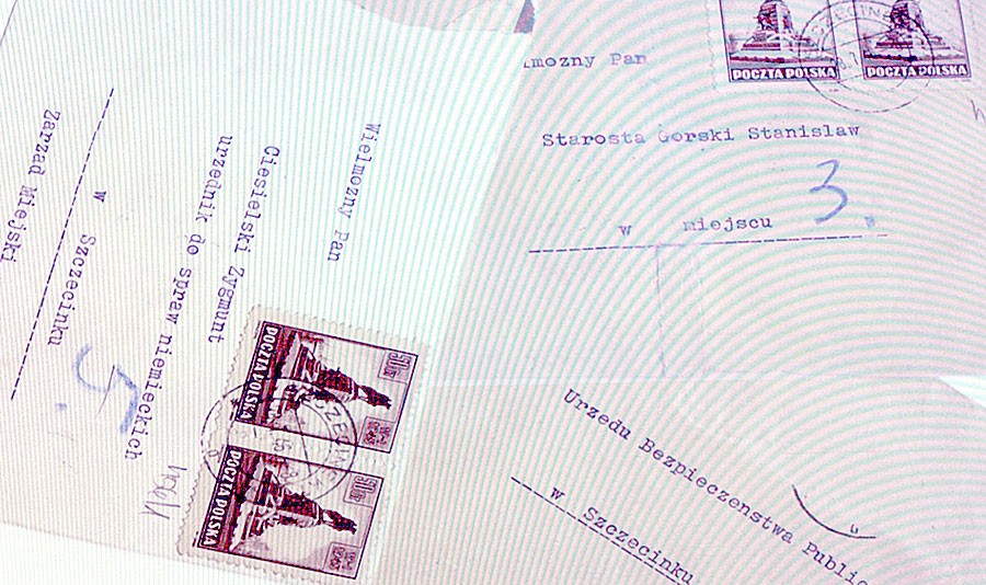 Armia Leśna działała na terenie Szczecinka w latach 1947-48. Na zdjęciu trzy koperty adresowane przez członków AL do starosty, UB i urzędnika do spraw niemieckich.