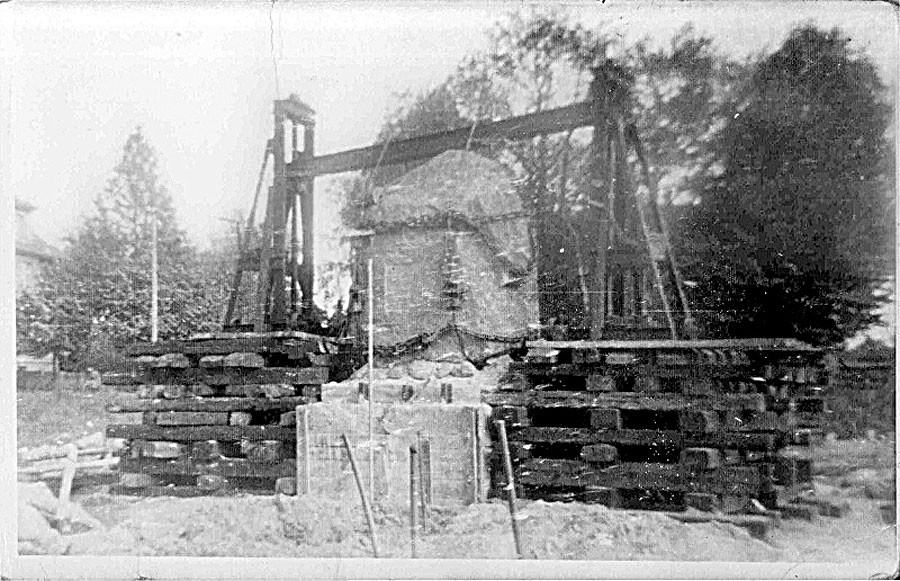 Kamień ustawiano sposobem „kolejarskim” za pomocą szyn podkładów kolejowych i napędzanych siłą ludzkich mięśni podnośników.