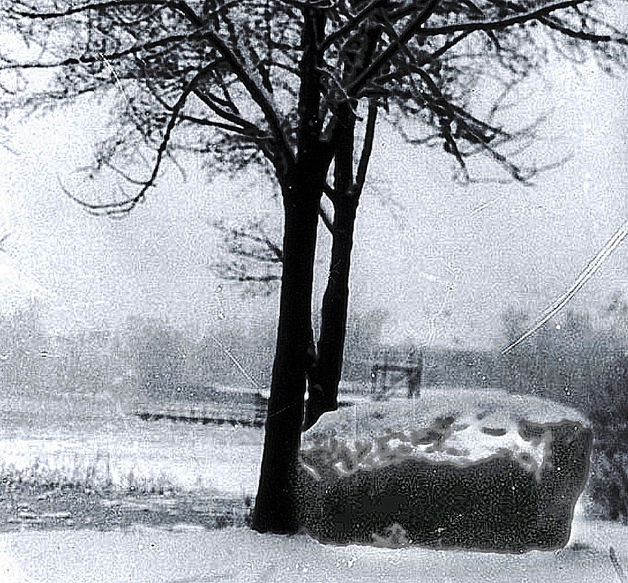 Autor zdjęcia p. Wilczyński twierdzi, że wykonał je na początku lat 50. ubiegłego wieku. Widzimy na nim wielki, przykryty śnieżnym puchem granitowy głaz. Zapewne było to wiosną 1957 roku. Któregoś dnia na parkowej alejce zjawił się czołg T34.