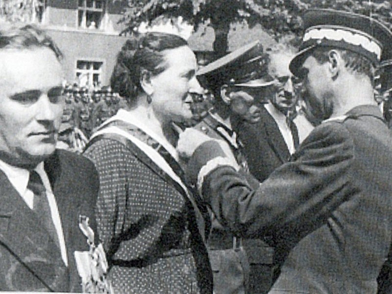 Generał Janusz Zarzycki dekoruje odznaczeniami budowniczych pomnika.