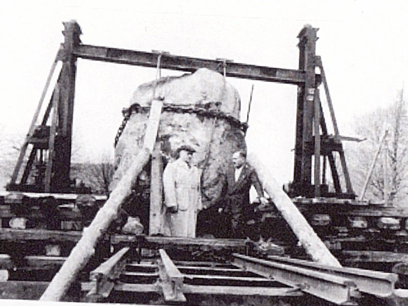 Przy głazie stoją Tadeusz Otto i Władysław Słomian.