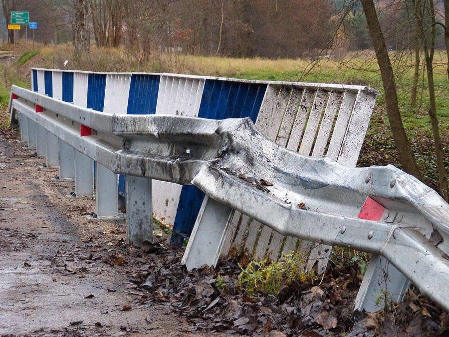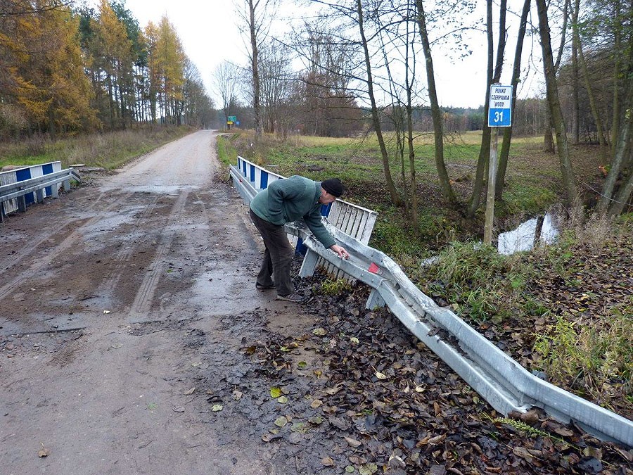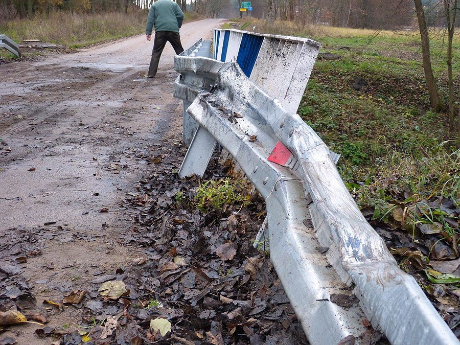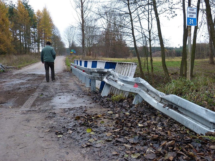 Zniszczona energochłonna bariera drogowa i wygięta stalowa balustrada mostu od strony lasu, a na całej powierzchni mostu ślady po rozlanym oleju. Musiało go być dość dużo, skoro wzdłuż przęsła widać liczne czarne zacieki. Ślady po rozlanym oleju zostały z