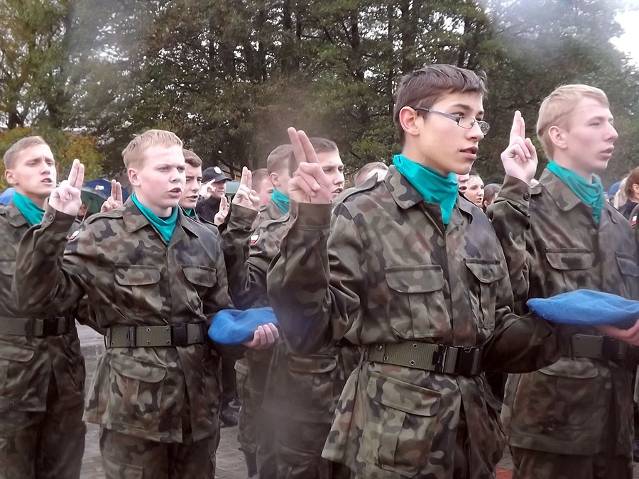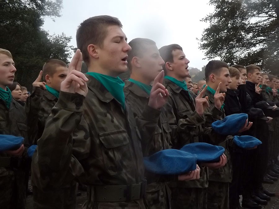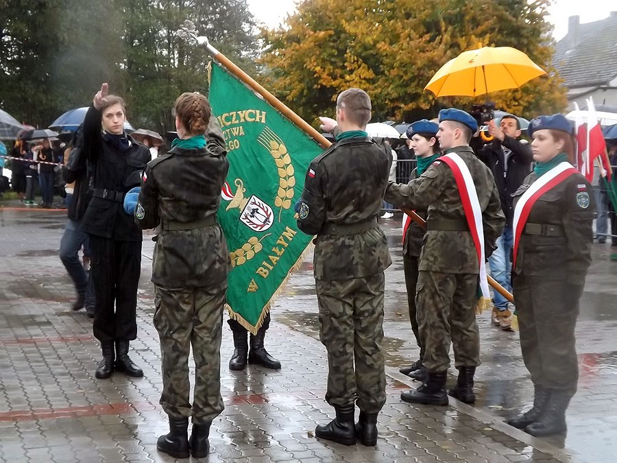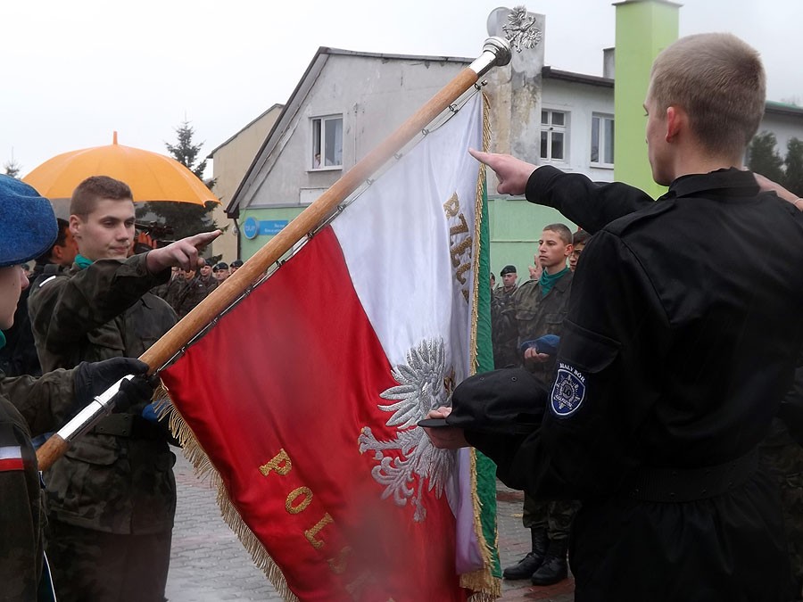 W strugach deszczu uczniowie klas mundurowych z Zespołu Szkół w Białym Borze złożyli ślubowanie na sztandar szkolny, że będą dobrymi policjantami i żołnierzami
