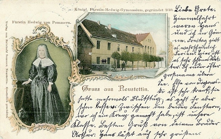 Ani chybi, wsparty o drzewo to uczeń tutejszego Gimnazjum Księżnej Jadwigi – dokładniej Des Fürstin Hedwig Gymnasiums. Jesteśmy przy wejściu od strony kościoła św. Mikołaja, po którym dzięki ludziom nonszalancko podchodzącym do dziedzictwa kulturowego, dz