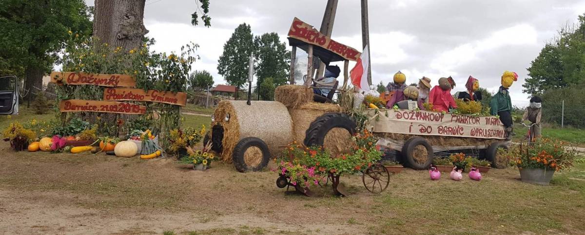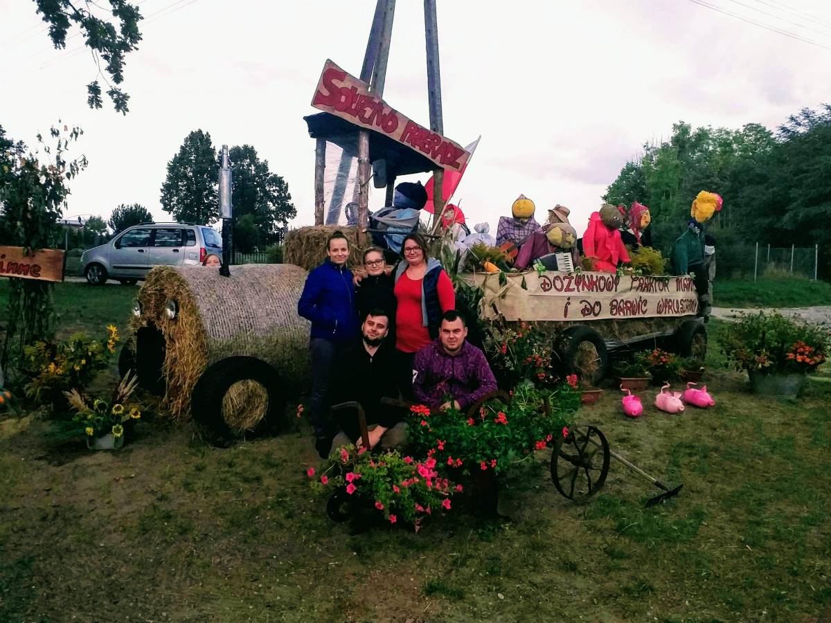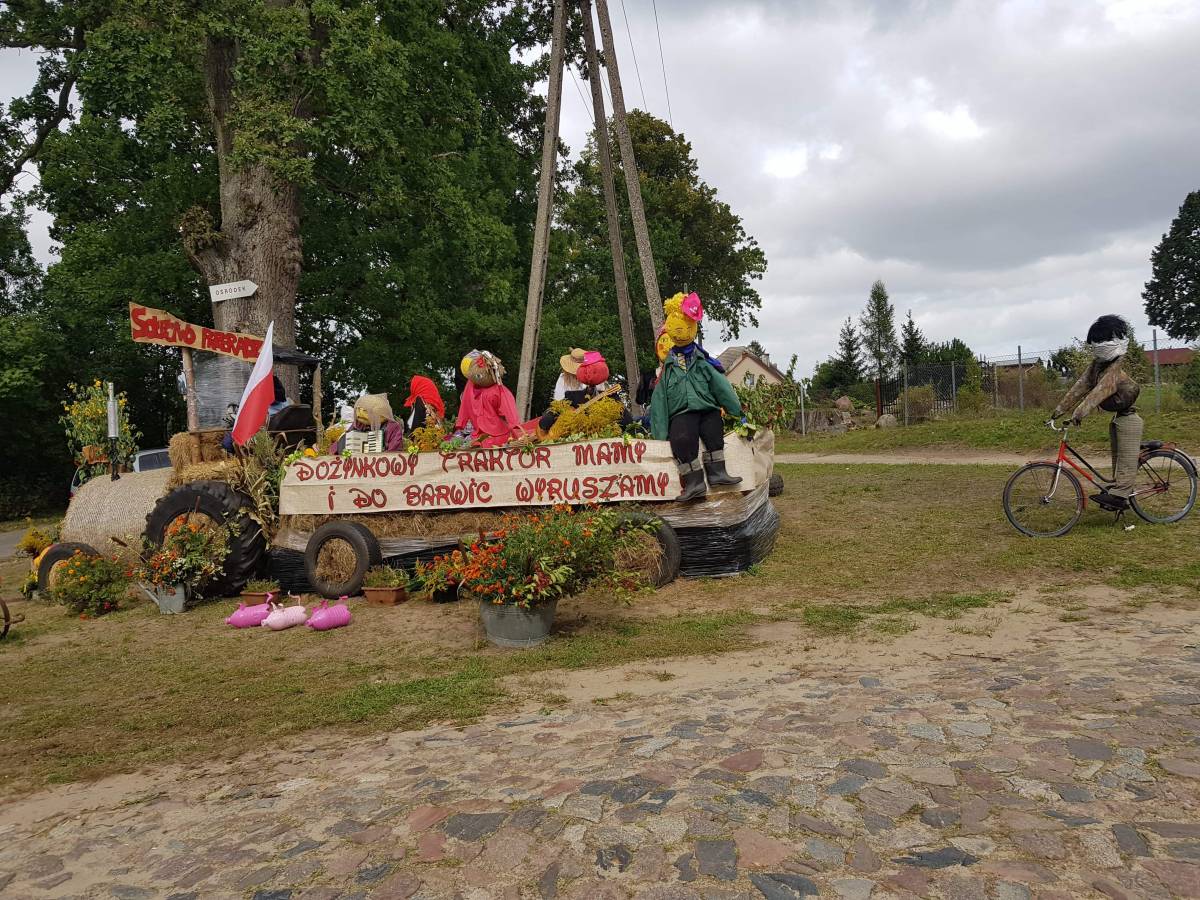 Zdjęcia Traktor z przyczepą, a na niej ludzie. Wszystko ze słomy. Super witacz dożynkowy w sołectwie Przeradz - fotorelacja