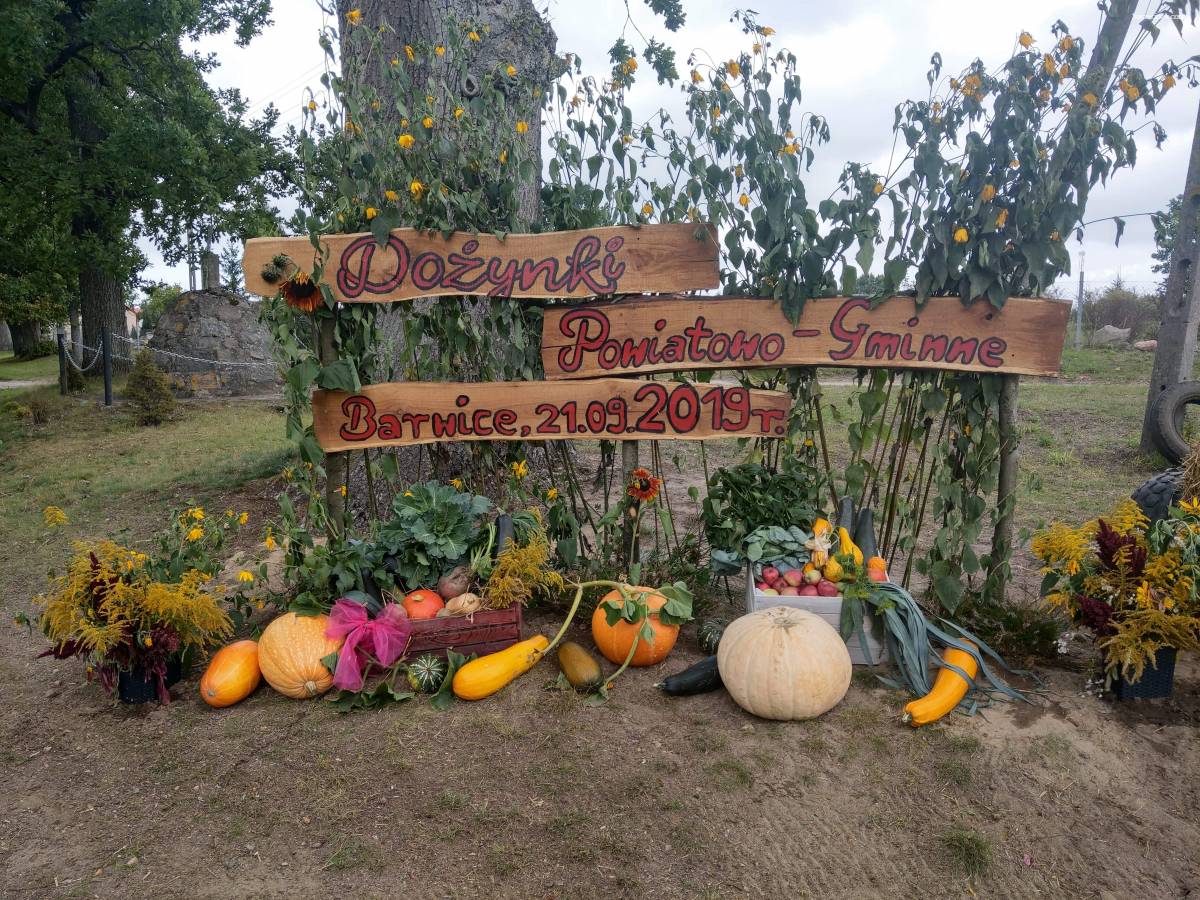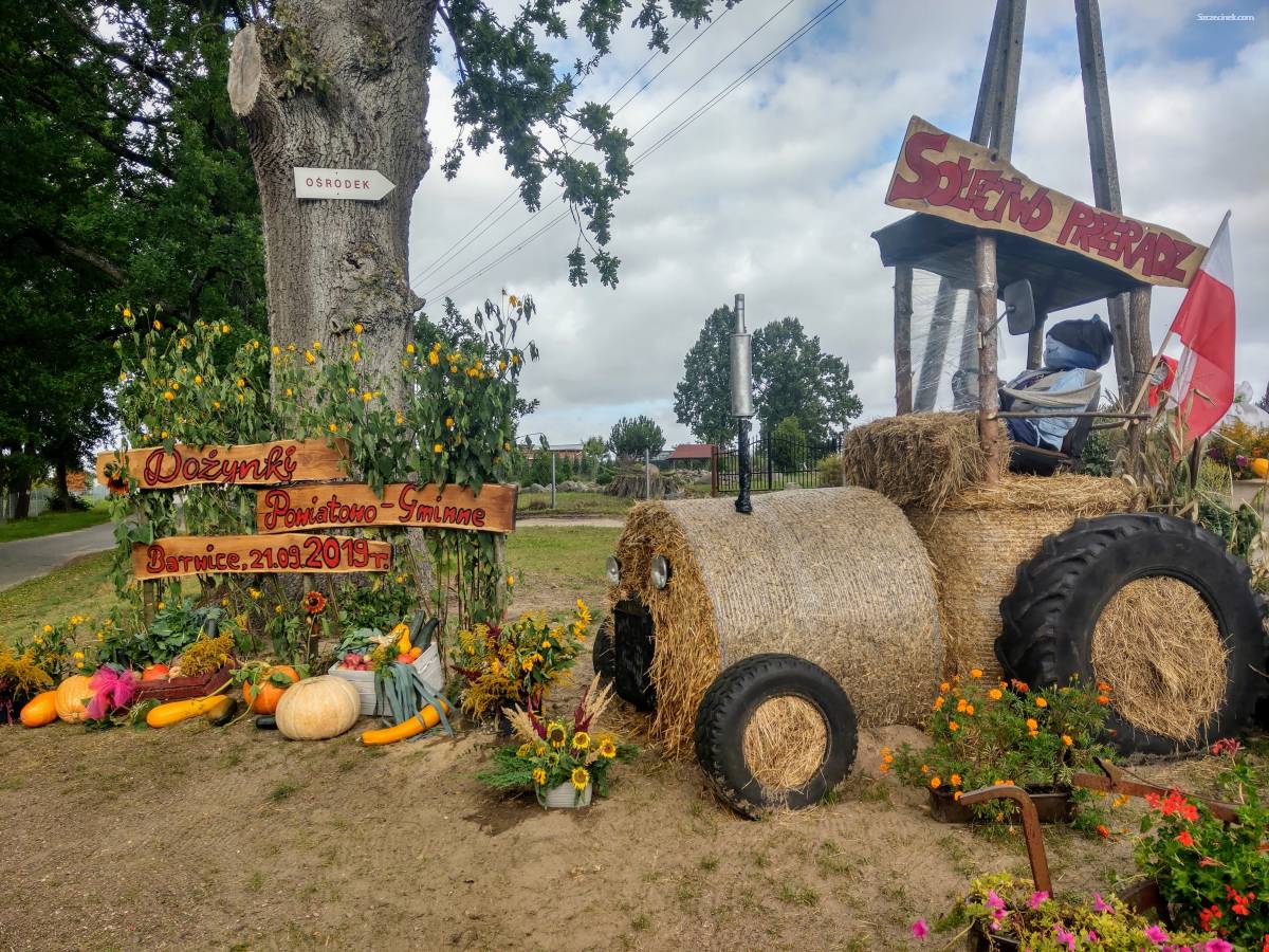 Traktor z przyczepą, a na niej ludzie. Wszystko ze słomy. Super witacz dożynkowy w sołectwie Przeradz