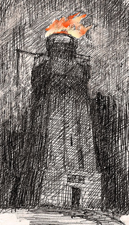 Być może tak prezentowała się wieża - pomnik ku czci Bismarcka podczas nacjonalistycznych, nocnych spektakli. W ogniowej misie, wyłożonej miedzianą blachą, rozpalano olbrzymi ogień. Za podpałkę służyły różnego rodzaju materiały, w tym smoła