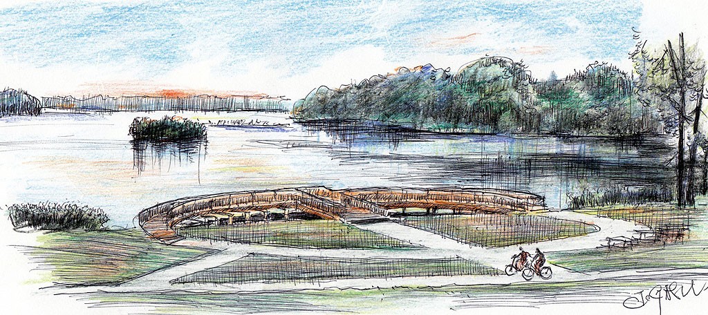Widok z podnóża wieży na jezioro letnią, wieczorową porą.