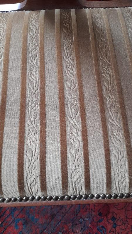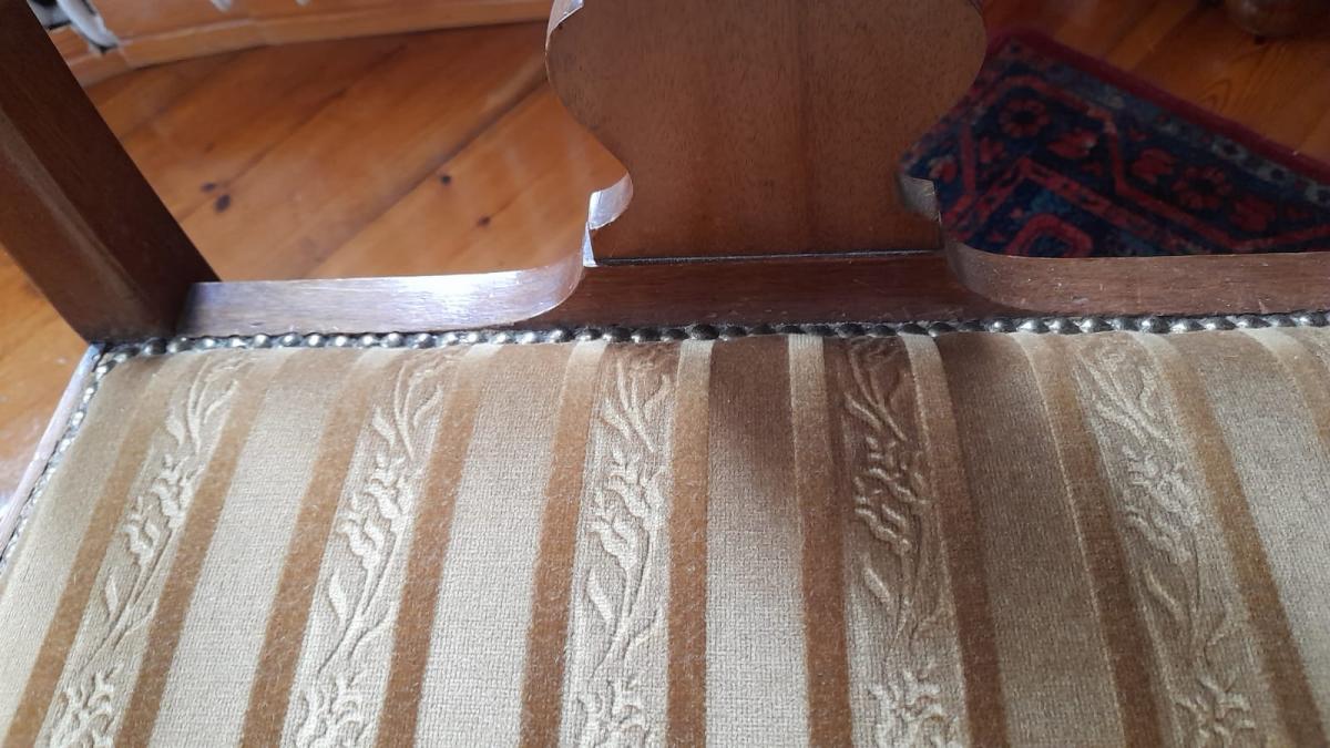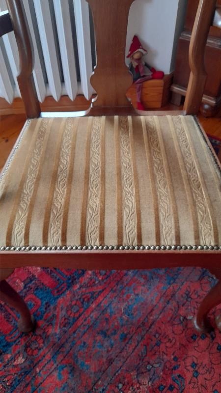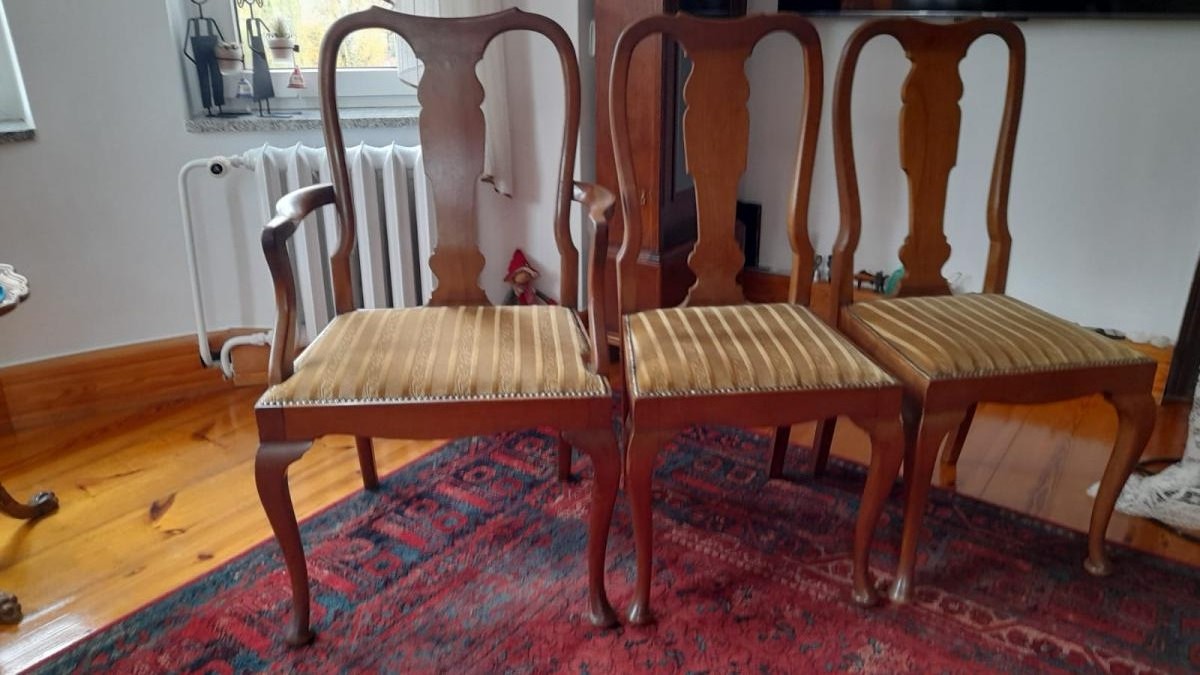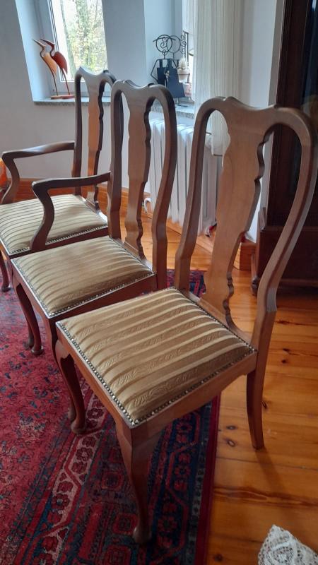 Zestaw dwóch eleganckich krzeseł oraz fotel. Meble wykonane z drewna, w jasnym, orzechowym kolorze. Siedziska niedawno tapicerowane beżową tkaniną w prążki w kolorze oliwki.