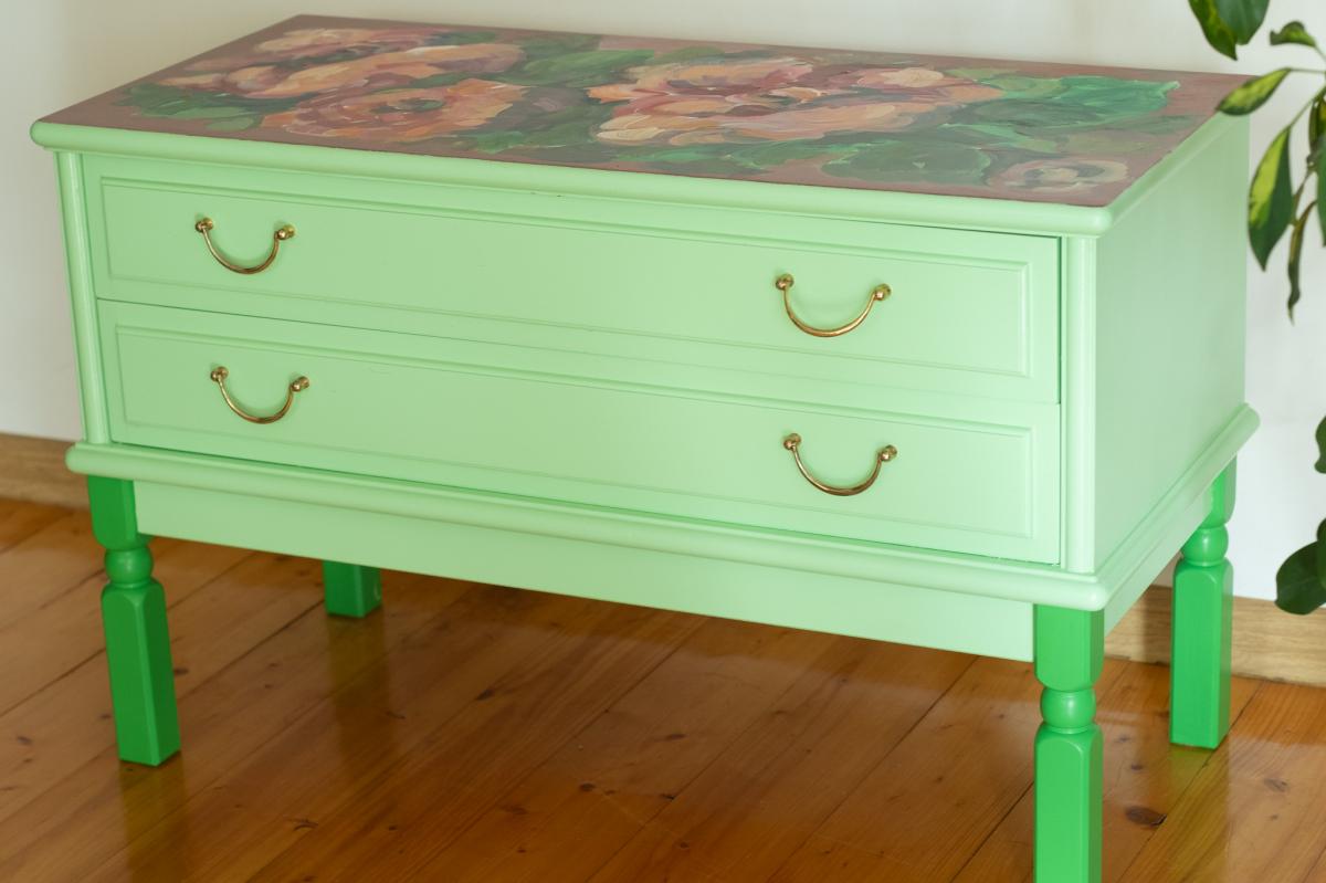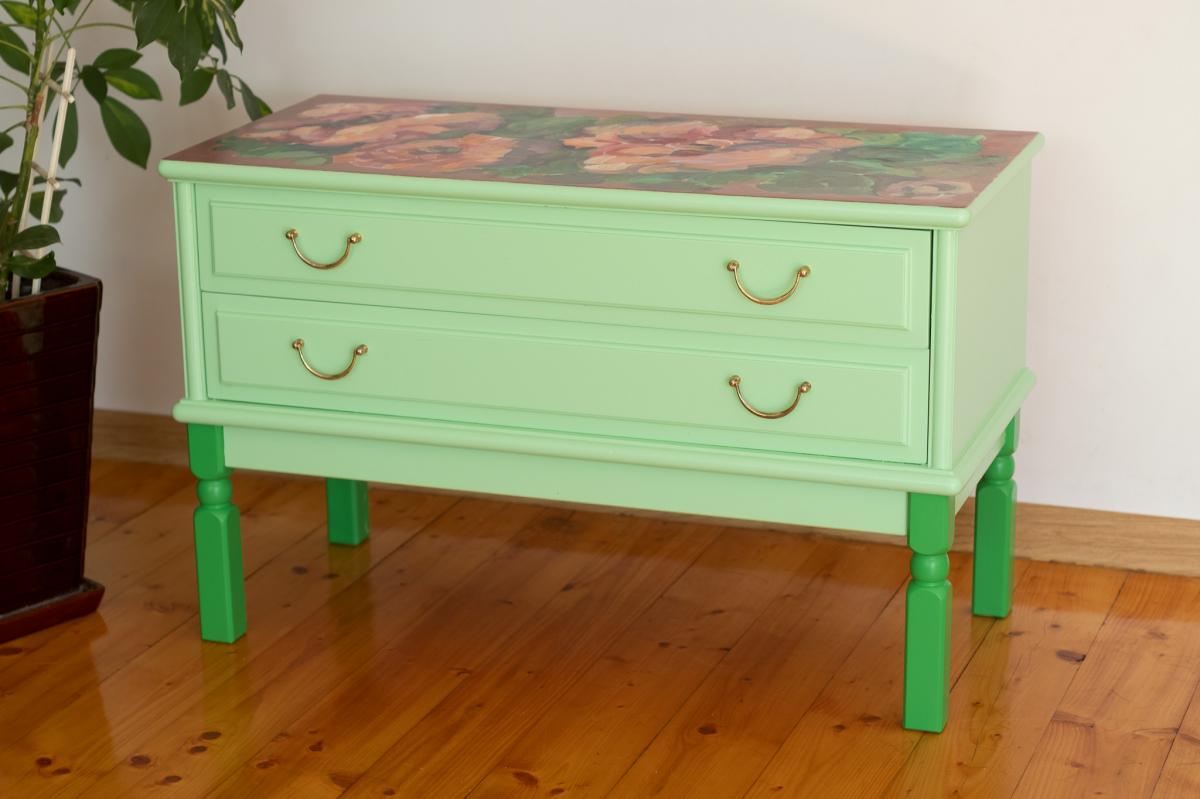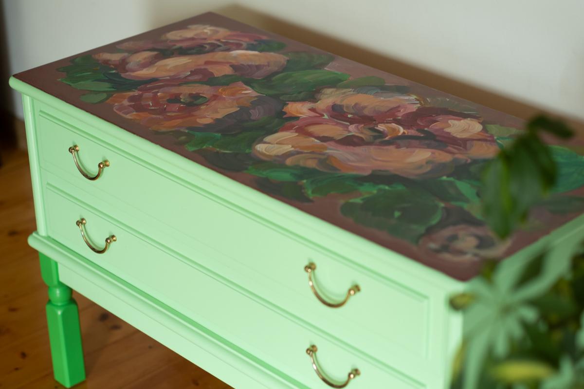 Sprzedam wyjątkową komodę z dwiema szufladami, która wyróżnia się niepowtarzalnym charakterem. Blat komody zdobi piękny kwiatowy motyw namalowany farbami akrylowymi przez profesjonalnego plastyka.