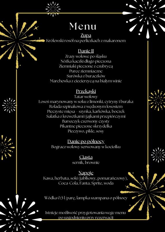 Zapraszamy na imprezę sylwestrową 31.12.2025 w godz. 19.00-3.00 . Zapewniamy szampańską zabawę, pyszne menu i niepowtarzalny klimat.